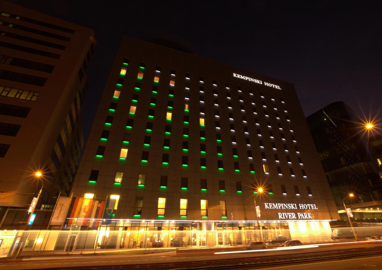 An interactive permanent lighting scheme animating facade of the newly built Kempinski Hotel in Bratislava's River Park - a multi-functional complex on the Danube riverside. A lighting concept has been developed for two main facades of the new hotel building - one facing the busy main road with entrance to the hotel, and the other one facing the internal courtyard opening up to the river promenade. The animated lighting plays with subtle colour changes though time in an orthogonal grid of windows, creating mood waves that capture attention of passing traffic in an elegant manner.